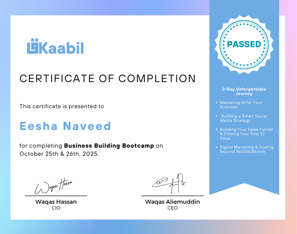 Every name you’ll see here once sat exactly where you are now. Curious, unsure, maybe even doubting if they could really make something happen. But their decision to join and learn from Kaabil changed everything. They came in with scattered ideas and left with systems, clarity, and confidence.