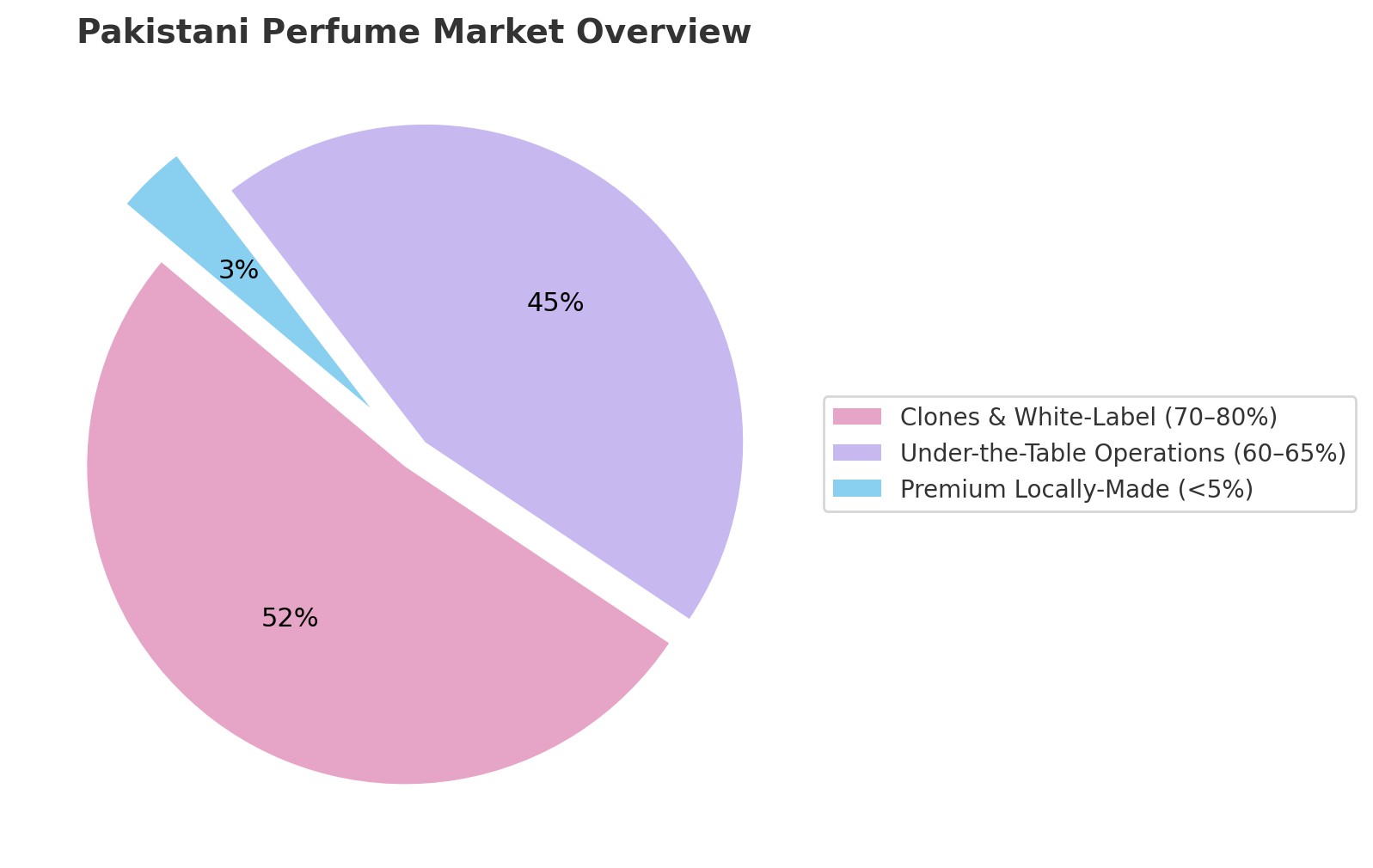 Clones & White-Label Products: 70–80% of the Pakistani perfume market is dominated by clones and white-label offerings, limiting originality and innovation (Euromonitor, 2023).